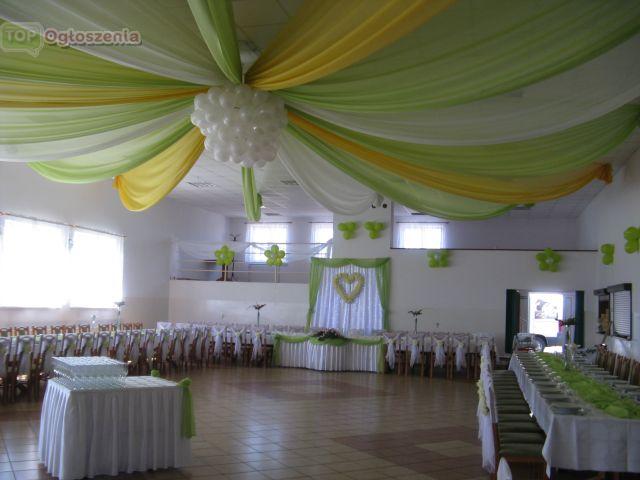 • dekoracja sali (sufitu, filarów) tkaninami w kolorach do wyboru klienta (dostępne kolory tkanin: biały, ecri, złoty, żółty, miodowy, łososiowy, różowy, seledynowy, zielony, pomarańczowy, herbaciany, bordowy, wiśniowy, jasny fiolet.)